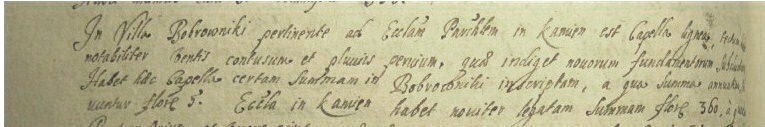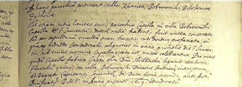 „We wsi Bobrowniki należącej do kościoła parafialnego w Kamieniu jest kaplica drewniana. Dach osobliwie żerdziami przed wichrem zabezpieczony przecieka, potrzebuje natychmiastowej budowy od podstaw.”