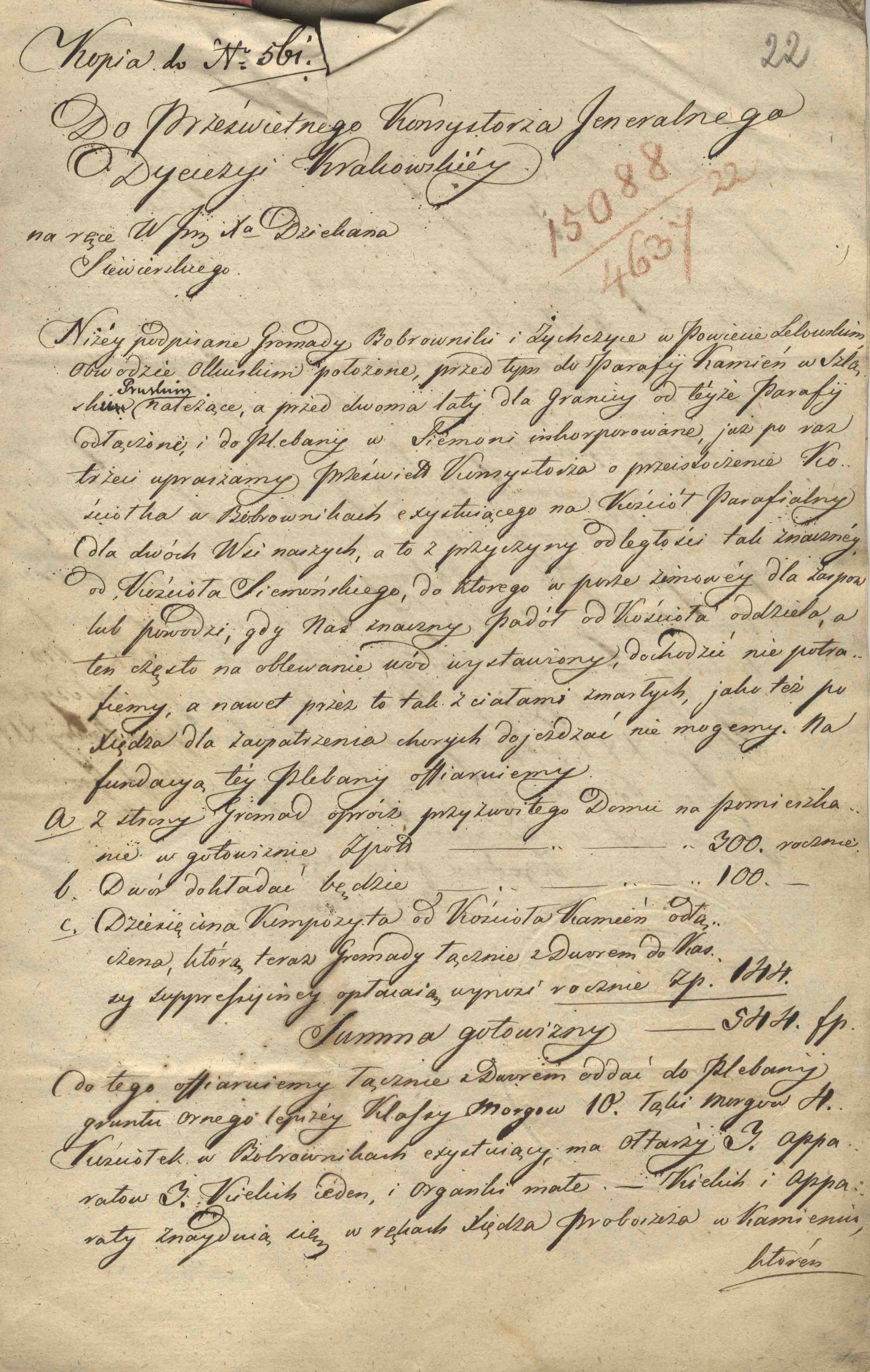 „Żądamy, aby parafia w kościółku niegdyś farnym, pod wezwaniem św. Wawrzyńca we wsi Bobrowniki, przywrócona została. Celem tego kościół przed dwoma laty kosztem 2 500 rubli odrestaurowanym został.”